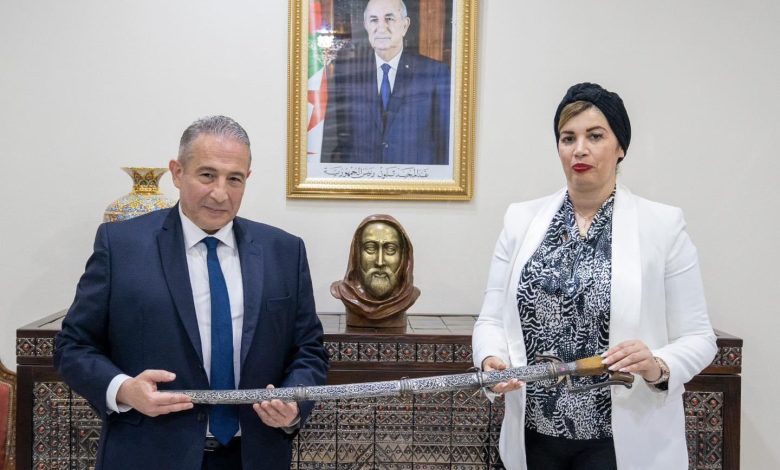 استقبلت السيدة وزيرة الثقافة والفنون الدكتورة صورية مولوجي مساء امس بمقر الوزارة، سعادة سفير الجزائر بباريس السيد سعيد موسي الذي سلمها قطعة أثرية ذات قيمة تاريخية كبيرة تتمثل في سيف الأمير عبد القادر.