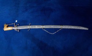 يجدر التنويه إلى أن هذا السيف الأثري يبلغ طوله 107 سم و هو مصنوع من مادة الفضة، به غمد خشبي مغطى بالفضة مزخرفة بلفائف أوراق الشجر ومزود بسوار بحلقتين معلقتين بسلسلة، وهو مؤرخ في الفترة الممتدة ما بين 1808 إلى 1883.