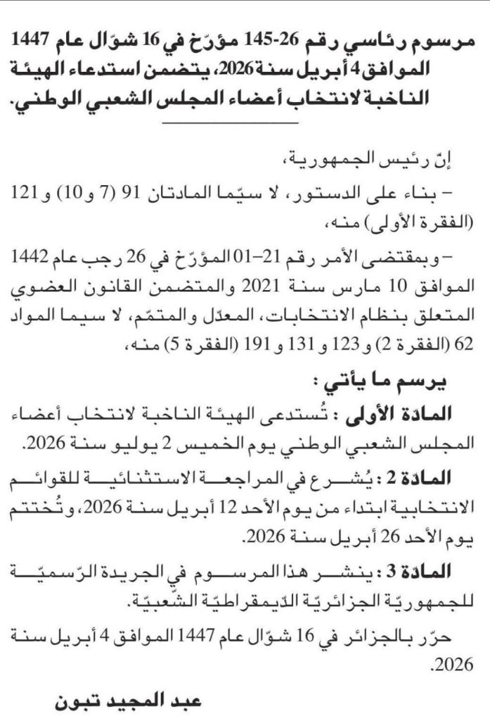 ويتعلق الأمر بالمرسوم الرئاسي رقم 26-145 المؤرخ في 16 شوال عام 1447 الموافق 4 أبريل 2026، والذي يحدد تاريخ إجراء استدعاء الهيئة الناخبة لانتخابات المجلس الشعبي الوطني يوم الخميس 2 يوليو 2026.