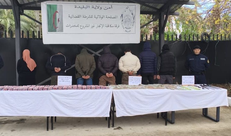 تمكنت عناصر فرقة مكافحة الإتجار غير المشروع بالمخدرات بالمصلحة الولائية للشرطة القضائية  لأمن ولاية البليدة  من الإطاحة بـ 07 أشخاص مشتبه فيهم من بينهم إمرأة  تتراوح أعمارهم ما بين 27 و 55 سنة ، منهم مسبوقين قضائيا ، مع ضبط كميات من المؤثرات العقلية   و مبالغ مالية من عائدات الاتجار بهاته السموم.