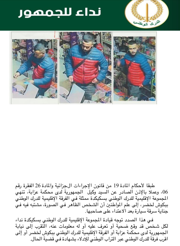 أعلنت المجموعة الإقليمية للدرك الوطني بسكيكدة، ممثلة في الفرقة الإقليمية للدرك الوطني ببكوش لخضر، وعملاً بأحكام المادة 19 من قانون الإجراءات الجزائية والمادة 26 الفقرة 06، واستنادًا للإذن الصادر عن السيد وكيل الجمهورية لدى محكمة عزابة، عن فتح بحث بخصوص الشخص الظاهر في الصورة، المشتبه في تورطه في جناية سرقة سيارة بعد الاعتداء على صاحبها.