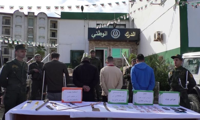 واستنادا لبيان المصدر ذاته، ” تم وضع خطة أمنية ومداهمة مساكنهم محكمة بالتنسيق مع الجهات القضائية أسفرت عن توقيف أربعة (04) أشخاص مسبوقين قضائيًا، مع حجز 243 قرصًا مهلوسًا من المؤثرات العقلية من نوع بريغابالين، إلى جانب أسلحة بيضاء من مختلف الأنواع والأحجام، ومبلغ مالي يقدر بـ 61.000 دج من عائدات الترويج، إضافة إلى هواتف نقالة استُعملت في النشاط الإجرامي”.