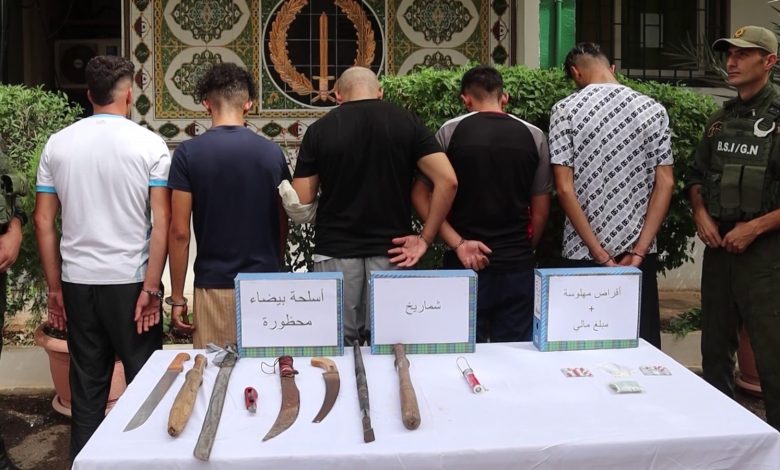 وعقب تنشيط عنصر الاستعلامات-يضيف المصدر نفسه- وضعت فرقة الدرك الوطني بزونكا خطة أمنية محكمة، انتهت بمداهمة مساكن المشتبه فيهم، حيث أسفرت العملية عن توقيف خمسة أشخاص متورطين، إلى جانب حجز ثلاثة سيوف كبيرة الحجم، شماريخ، عصا بيسبول، منشار بمقبض خشبي، عصا حديدية، وأقراص مهلوسة.