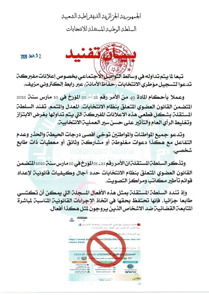 فنّدت السلطة الوطنية المستقلة للانتخابات، لما يتم تداوله في وسائط التواصل الاجتماعي، بخصوص إعلانات مفبركة تدعو لتسجيل مؤطري الانتخابات (حفاظ الأمانة) عبر رابط إلكتروني مزيف.