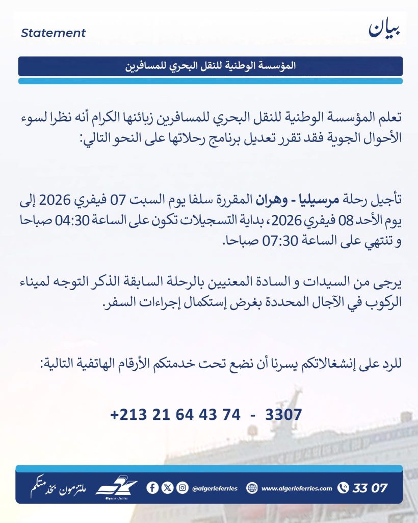 أعلنت المؤسسة الوطنية للنقل البحري للمسافرين عن تعديل في برنامج رحلاتها البحرية، وذلك نتيجة سوء الأحوال الجوية التي تشهدها مناطق العبور، في إطار حرصها على ضمان سلامة المسافرين وحسن سير الرحلات.