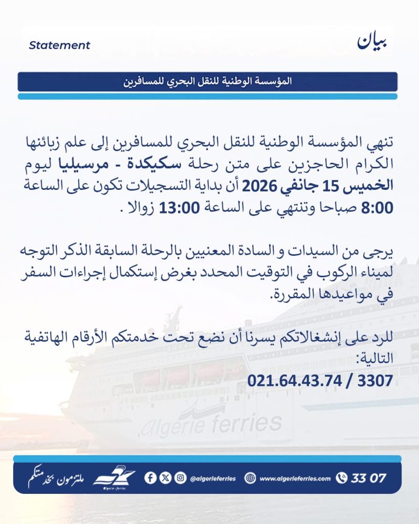 أعلنت المؤسسة الوطنية للنقل البحري للمسافرين، في بيان لها، عن انطلاق عملية تسجيل المسافرين المعنيين برحلة سكيكدة-مرسيليا المبرمجة ليوم الخميس 15 جانفي 2026، إبتداءً من الساعة 08:00 صباحًا إلى غاية 13:00 زوالًا.