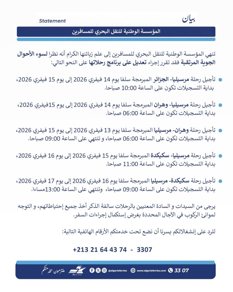 تأجيل رحلة وهران – مرسيليا المبرمجة سلفا يوم 13 فيفري 2026 إلى يوم 15 فيفري 2026، وستنطلق التسجيلات انطلاقا من الساعة 06:00 صباحا، وتنتهي على الساعة 09:00 صباحا.