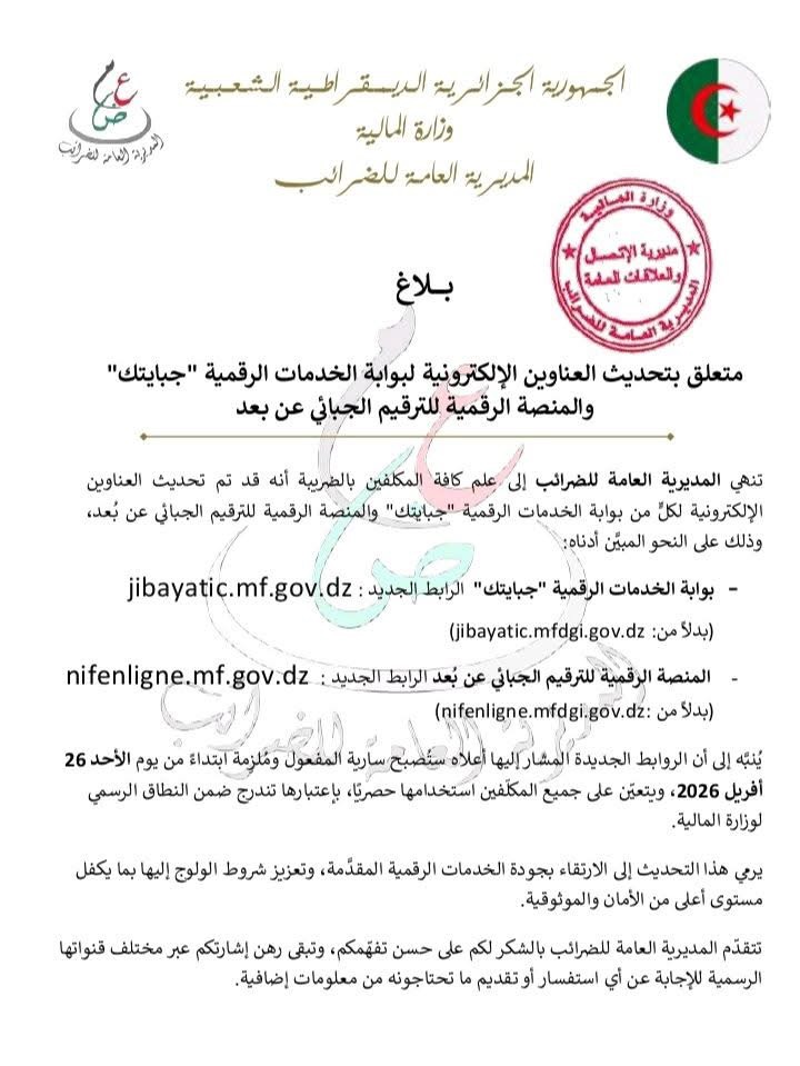وأوضح ذات البيان، أن الرابط الجديد لبوابة “جبايتك” أصبح (jibayatic.mf.gov.dz) بدلاً من العنوان السابق، كما تم تغيير رابط المنصة الرقمية للترقيم الجبائي عن بعد ليصبح (nifenligne.mf.gov.dz).