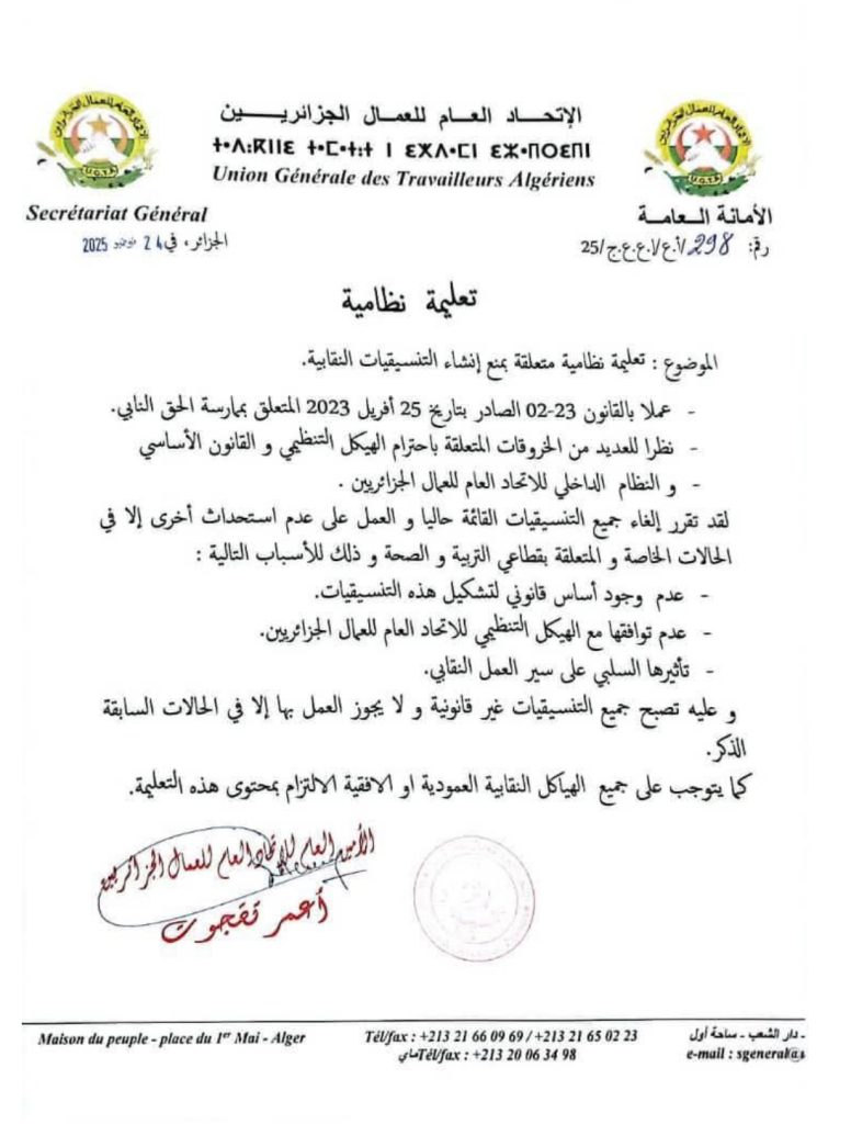 أعلنت هيئة الاتحاد العام للعمال الجزائريين اليوم الاثنين عن إلغاء جميع التنسيقيات النقابية القائمة، مؤكدة أنها لن تسمح بإنشاء أي تنسيقيات جديدة إلا في حالات خاصة تتعلق بقطاعي التربية والصحة. وجاء هذا القرار وفق بيان رسمي نشرته الهيئة، في إطار ضبط العمل النقابي وضمان التزام الهياكل بالقوانين والأنظمة الداخلية للاتحاد.