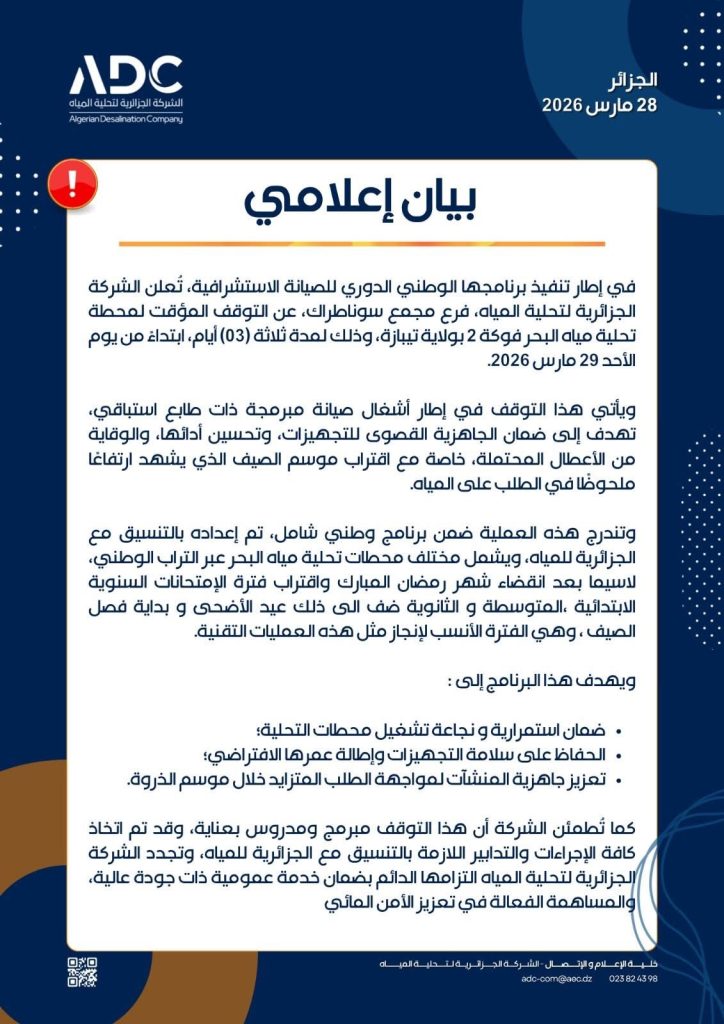 وختاماً طمأنت الشركة في بيانها، أن هذا التوقف مبرمج ومدروس بعناية، وقد تم اتخاذ كافة الإجراءات والتدابير اللازمة بالتنسيق مع الجزائرية للمياه، وتجدد الشركة الجزائرية لتحلية المياه التزامها الدائم بضمان خدمة عمومية ذات جودة عالية، والمساهمة الفعالة في تعزيز الأمن المائي.