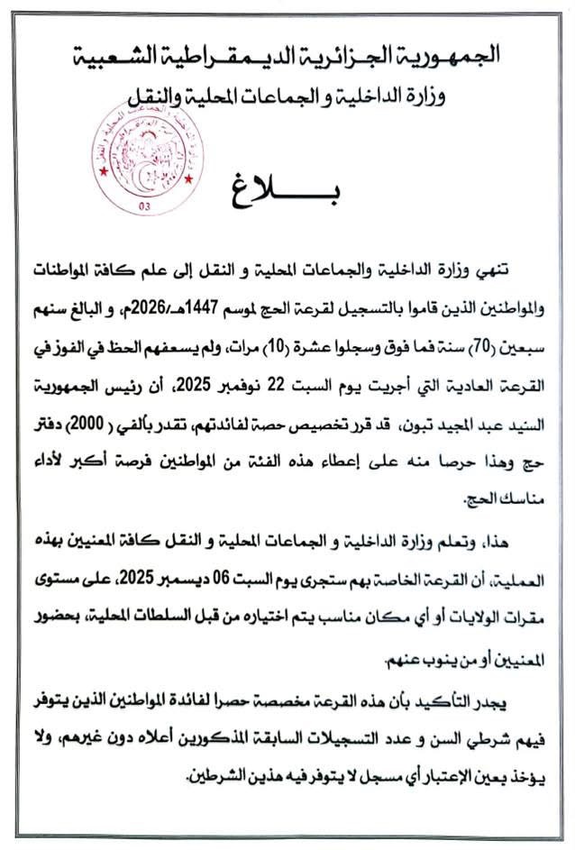 وأشارت وزارة الداخلية في بيانها إلى إجراء قرعة خاصة بهذه الفئة المذكورة والتي تتوفر فيها الشروط يوم السبت 06 ديسمبر 2025 على مستوى مقرات الولايات أو أي مكان مناسب يتم إختياره من قبل السلطات المحلية.