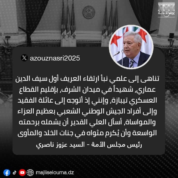 تقدّم السيد عزوز ناصري رئيس مجلس الأمة، اليوم الإثنين بعظيم العزاء والمواساة الى عائلة الفقيد و إلى أفراد الجيش الوطني الشعبي إثر إستشهاد العريف أول سيف الدين عماري بإقليم القطاع تيبازة بالناحية العسكرية الأولى.