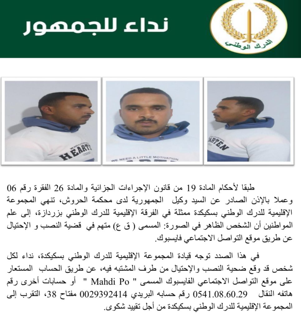 وجّهت المجموعة الإقليمية للدرك الوطني بسكيكدة، ممثلة في الفرقة الإقليمية للدرك الوطني بزردازة، تنبيهاً للمواطنين بخصوص شخص متهم في قضية نصب واحتيال وفقا للمادة 26 من قانون الإجراءات الجزائية (ق.ع)، وذلك بناءً على الإذن الصادر عن وكيل الجمهورية لدى محكمة الحروش.