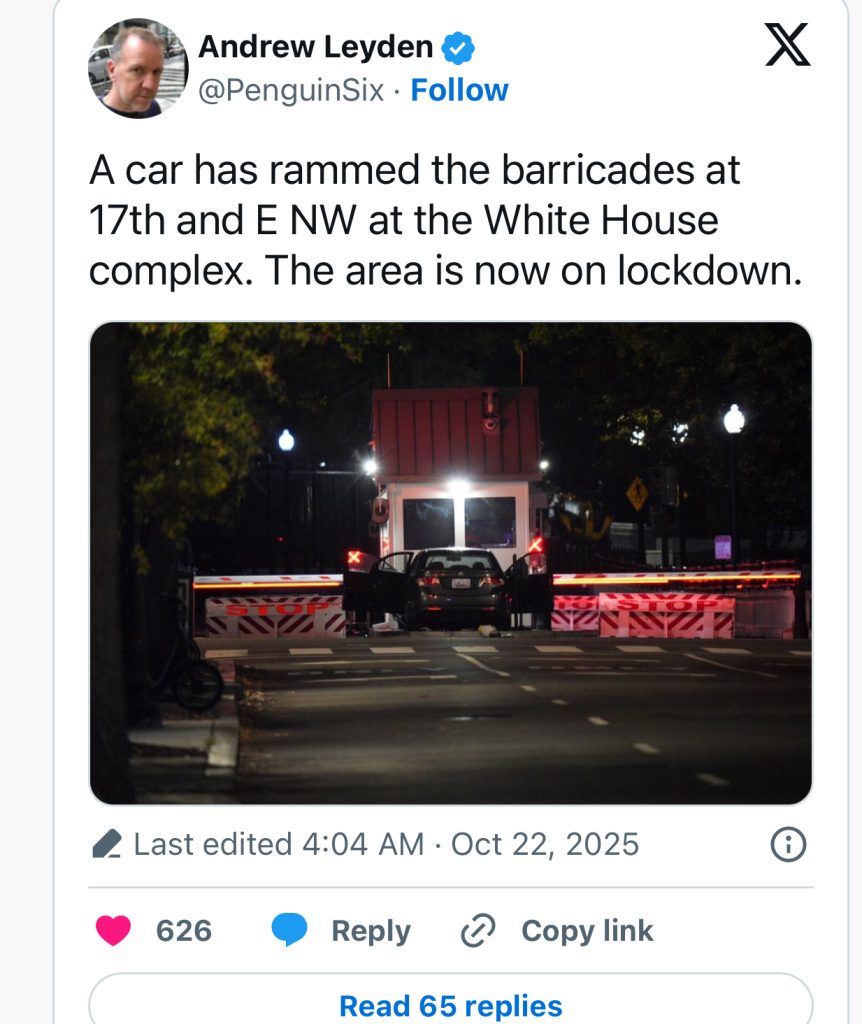 وأوضحت الخدمة السرية الأمريكية أن الحادث وقع الساعة 22:37 بالتوقيت المحلي، وتم القبض على السائق فوراً، كما خضع فحص السيارة للتأكد من عدم وجود أي مواد خطرة، ولم تكشف السلطات بعد عن هوية الرجل أو دوافعه وراء الحادث.