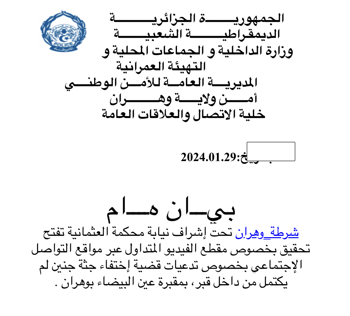 وأكدت مصالح شرطة وهران في البيان أن ” شرطة وهران تحت إشراف نيابة محكمة العثمانية تفتح تحقيق بخصوص مقطع الفيديو المتداول عبر مواقع التواصل الإجتماعي بخصوص تدعيات قضية إختفاء جثة جنين لم يكتمل من داخل قبر، بمقبرة عين البيضاء” .