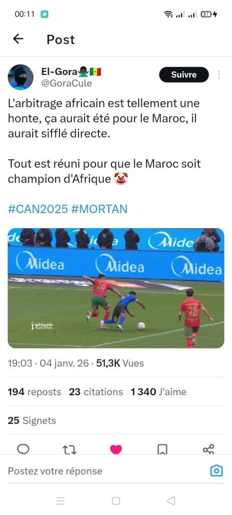 ومع صافرة النهاية، انفجرت مواقع التواصل الاجتماعي غضبًا، وكتب مشجعون من مختلف الجنسيات تعليقات نارية ” أوقفوا الكان وامنحوا المغرب الكأس مباشرة بدل هذه المسرحية” ، و” هذا غش واضح… يريدون تتويج المغرب بأي طريقة”، معتبرين أن ما جرى تجاوز الأخطاء التحكيمية العادية إلى “توجيه ممنهج” للبطولة، وضرب صريح لمبدأ تكافؤ الفرص.