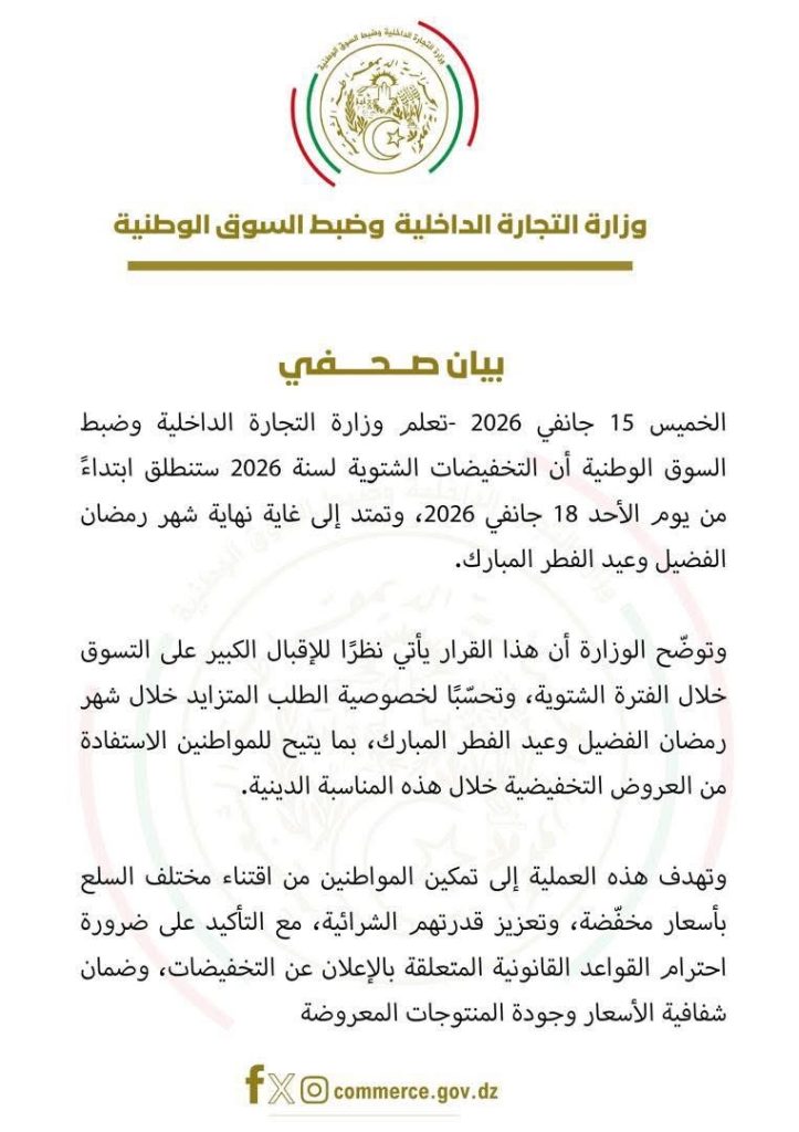 أعلنت وزارة التجارة الداخلية وضبط السوق الوطنية اليوم الخميس في بيان لها، أن التخفيضات الشتوية لسنة 2026 ستنطلق ابتداءً من يوم الأحد 18 جانفي 2026، وتمتد إلى غاية نهاية شهر رمضان الفضيل وعيد الفطر المبارك.