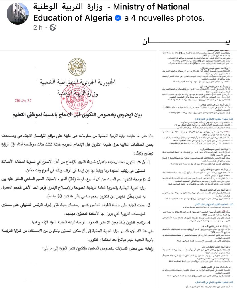 أصدرت وزارة التربية الوطنية، اليوم الخميس، بيانًا لتوضيح حقيقة التكوين قبل الإدماج لموظفي التعليم، وذلك بعد انتشار معلومات غير دقيقة على مواقع التواصل الاجتماعي وصفحات بعض النقابات حول طبيعة هذا التكوين.