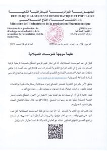 وأشارت التعليمة، أن البرامج التقديرية يتم تقديمها عبر البوابة المخصصة للبرنامج التقديري للصادرات المتوفرة على مستوى الموقع الرسمي لوزارة الصناعة الصيدلانية على :www.miph.gov.dz/mipform/ppe