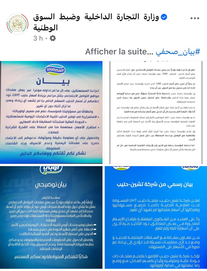 Le communiqué précise que le ministère a obtenu des données officielles auprès des grandes entreprises nationales de production, à savoir Soummam, Tchin-Lait “Candia” et Hodna Lait, lesquelles ont confirmé de manière catégorique qu’aucune augmentation n’a été appliquée, les prix demeurant inchangés sur le marché national. Le ministère a salué, à cette occasion, la position de ces entreprises nationales ainsi que leur responsabilité sociale dans la préservation du pouvoir d’achat des citoyens et la garantie de la stabilité de l’approvisionnement.